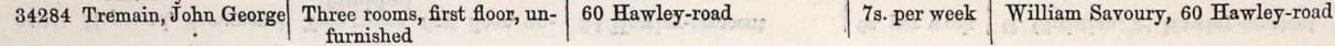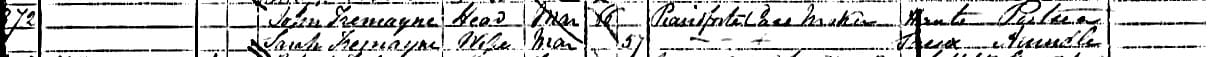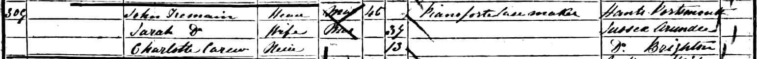 John Tremain, entered as “Pianoforte Case Maker,” 3 Upper Hartland Rd., Kentish Town. 1861 U.K. Census.