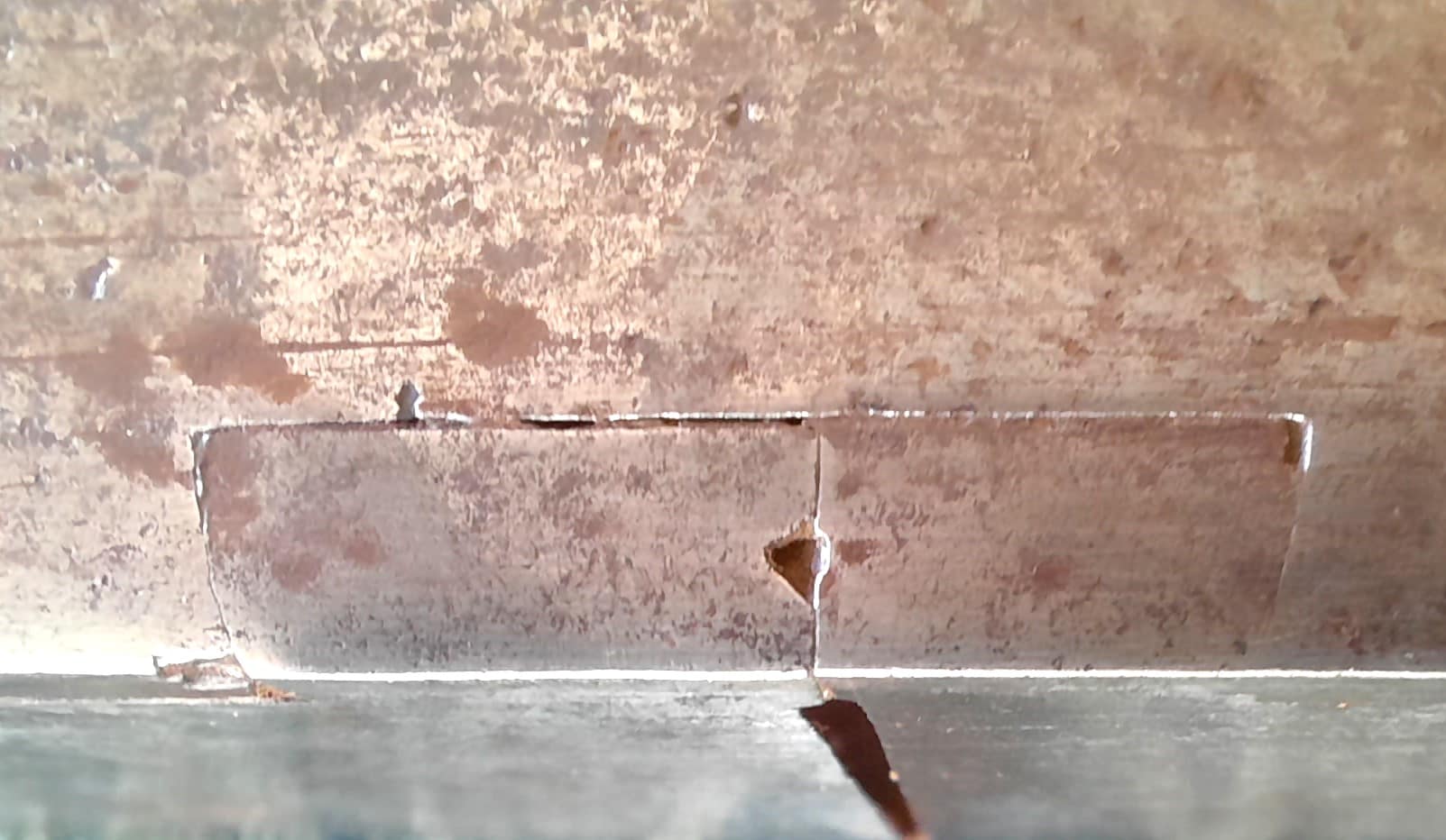 The wedged Kerr mitre plane has 3 long dovetails on each side: 1 dovetail in front of the mouth, and 2 dovetails behind the mouth. The sole is joined at the mouth with a modified butt joint that appears to have a small triangular shaped wedge driven in after assembly. Iron stock for the sidewalls is of normal thickness for the period, and the heel was bent in a single horseshoe bend. Flange extensions on the toe and heel are short, resulting in a plane 7 7/8″ long. And the sole is 2 1/4″ wide, with a 2″ iron.