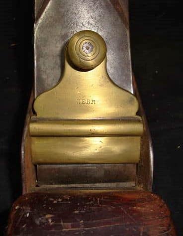 Closeup of levercap screw on Cox adjustable mouth mitre plane, with two knurling rings. Cox’s octagonal lever cap screws typically had three rings of fine knurling: 2 on top, 1 underneath, revealing scrupulous attention to detail.