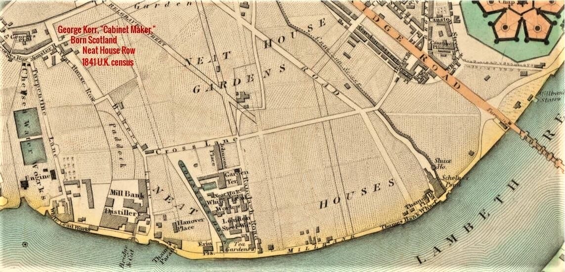 George Kerr, “Cabinetmaker,” and his younger siblings/cousins on Neat House Row, Millbank in the 1841 U.K. census. During the time of the 1841 census, George and five of his younger cousins or relatives lived at Neat House Row, in the Millbank area of London. Neat House Gardens were a source of fresh cauliflowers, cabbage, artichokes, asparagus, beans, spinach and radishes for London in the 17th and 18th centuries. Fruit was also cultivated. With alluvial soil, a high water table, and plenty of manure, the land was very arable. By 1841, however, development was encroaching on this area, and market gardeners were forced to move further from London.