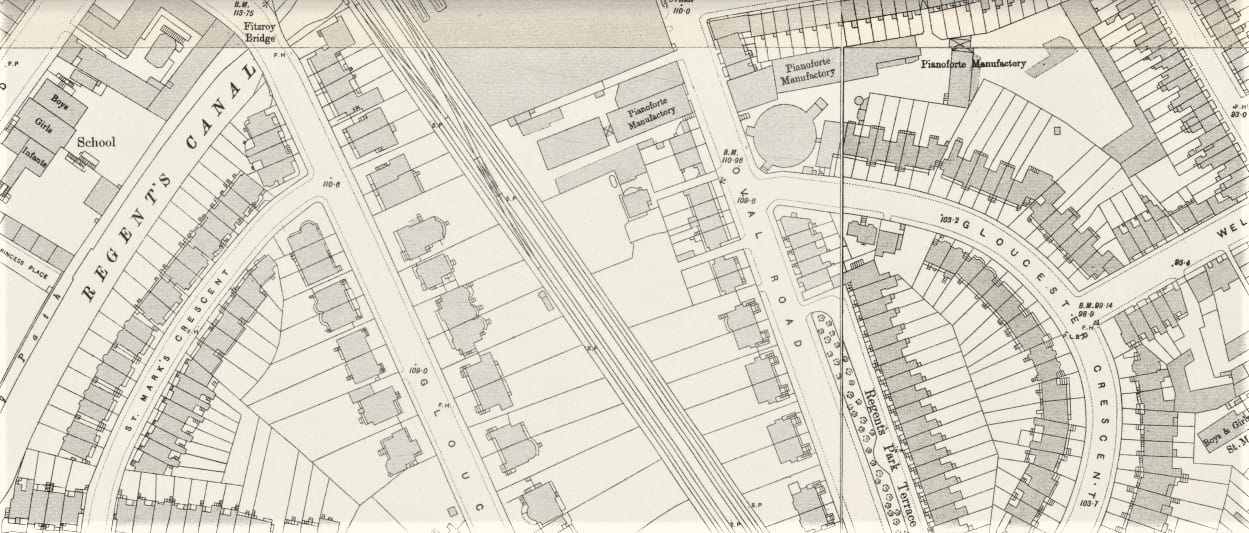 “Camden Town established itself as a major piano manufacturing centre in the nineteenth century, drawing industry away from Fitzrovia, because of the ease of transporting timber by canal, rail and road. It was said that every street in north London contained a piano works, and in many parts of Camden this was literally true. Between 1870 and 1914 Camden was the centre of the world’s manufacture of pianos which were sent around the globe. There were around one hundred in total. None now remain, although Heckscher & Company – which only in recent months moved out of 75 Bayham Street in Camden – has been supplying piano parts since 1883 and still does.