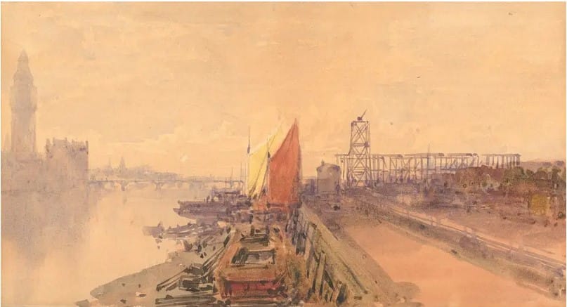 Saint Thomas’ Hospital and Albert Embankment Construction. Watercolour by William Roxby Beverley, c. 1869.