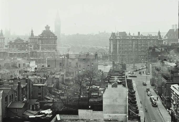Arial view of Stangate St., looking west towards Palace Road, St. Thomas’ Hospital, and Westminster Bridge. n this photo you can also see St. Thomas’ Hospital, and through the haze, Westminster Bridge. The Clock Tower (Elizabeth Tower) with Big Ben, stands near the western side of the river Thames.