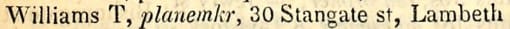 Thomas Williams, wooden planemaker, Robson’s 1840 London City Directory. Williams left 30 Stangate Street in the early 1840s; the proximity to Badger at 27 Stangate was a coincidence. No known connection.