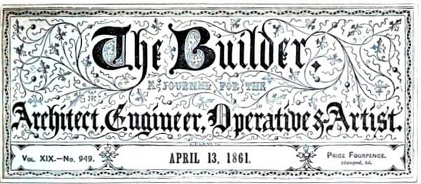 Header from “The Builder,” 13 April, 1864. The Builder was a journal of architecture published in the UK from 1843 until 1966.