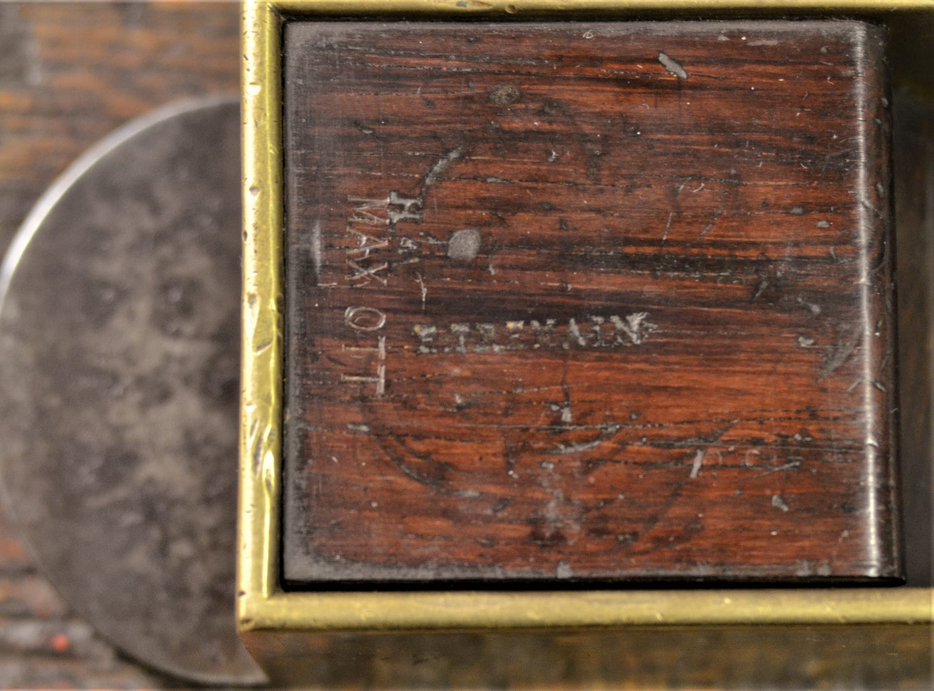 It is unknown whether or not John George Tremain continued to make planes while in London, but if this mitre was created new for Frederick, he would have finished his apprenticeship around 1850. The plane could have been made from as early as the late 1820s and as late as 1850. The features of the mitre plane, and the one line stamp of William Ash on the iron suggest earlier manufacture.