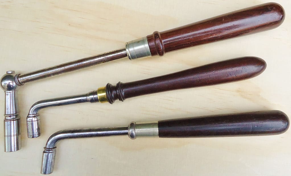 At the back is the standard model which was offered in 1885, continued in production, and shown in catalogs as late as the 1930s. In the front is a small gooseneck tuning lever, very well made and probably produced early in Napoleon Erlandsen’s working life, c.1860s. Inside the rosewood handle, it has a steel shaft sheathed in a brass tube, with a detailed German silver ferrule and steel collar. This is much like the construction of Erlandsen’s extension hammers. It is a similar size to the antique French hammer (c.1840s) which is shown in the middle.