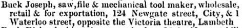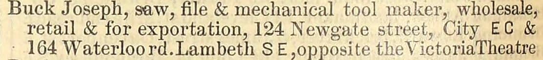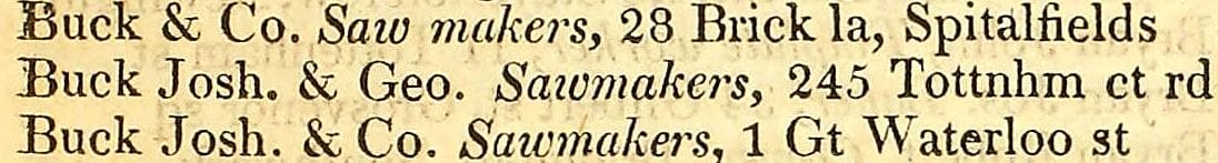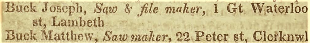 Matthew Buck 22 Peter St. Clerkenwell, under “Saw Makers,” in the 1825-6 Pigot’s London Street Directory.