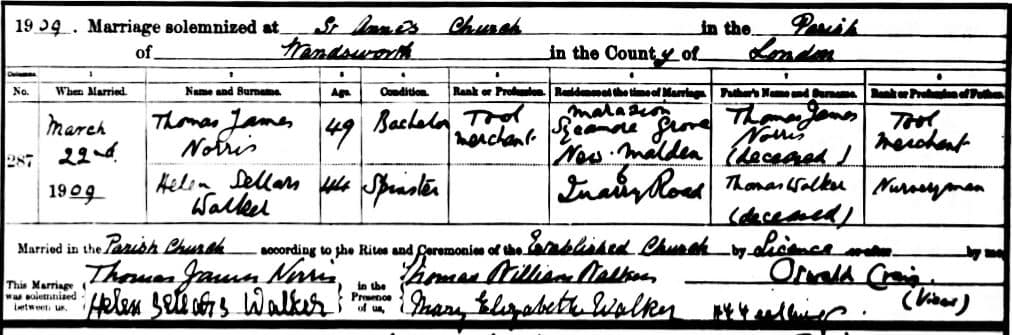 Thomas J. Norris married Helen Sellars Walker, 22 March, 1909, at St. Anne’s in Wandsworth. Thomas Jr., 49, married Helen Sellars Walker, 44. It was a late marriage for both of them. Helen was living at 6 Quarry Rd.,