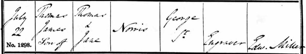 Thomas Norris (the elder) was baptized 30 December, 1804, at St. Mary’s Chuch in Lambeth. Thomas’ parents were George Norris (1773-1845), and Rebecca Cooper, (1775-1843). George and Rebecca were married in 1802.