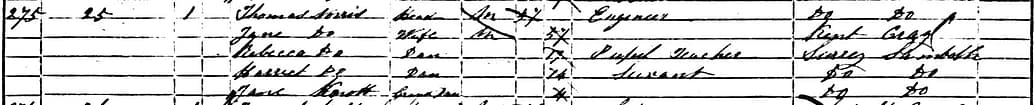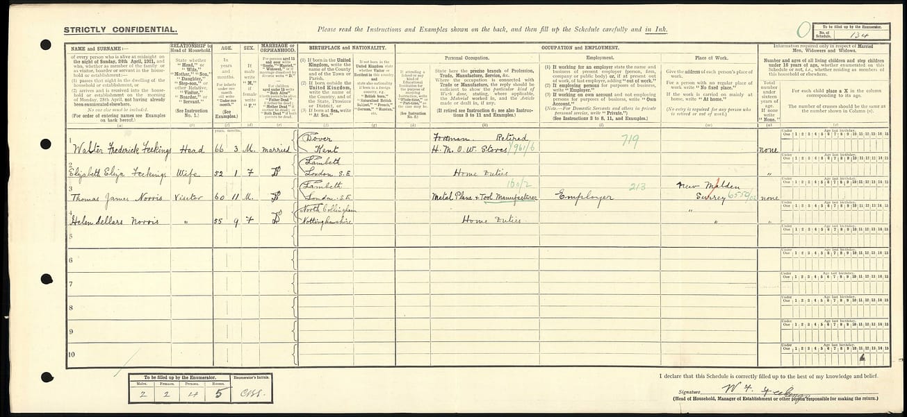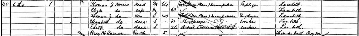 Thomas J.Norris Sr. and Jr., and family, in the 1901 U.K. Census. 6 Quarry Road, Wandsworth, Surrey.