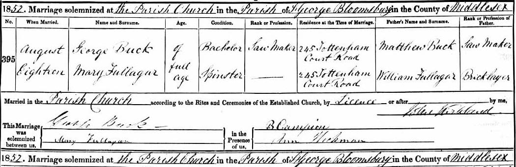 George Buck marriage to Mary Fullagar, 18 August, 1852. William Fullagar also lived at 245 Tot. Ct. Rd. George and Mary were living together at 245 Tottenham Court Road, with their third child, more than 11 years before their marriage to each other. Typical of the mid-19th century, George Buck had a large family: George married Mary Fullagar and they had at least nine children. Or more accurately, George and Mary had a lot of children, then they got married.
