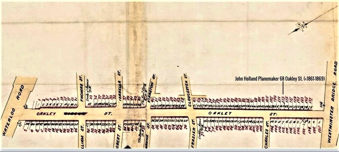 1870 London P.O. Directory: “John Holland, Gunmetal & Iron Planemaker. 68 Oakley Street, Lambeth. S.E.”