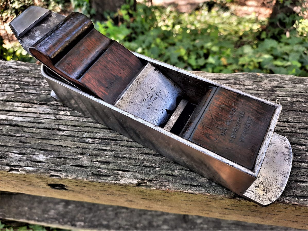 In the case of Smoother No. 213, a large “I.H.” was added into the casting underneath the rear infill. I would not have discovered this unless the rear infill had come unglued. Additionally, “Holland, London” was stamped into the underside of the bronze lever cap.