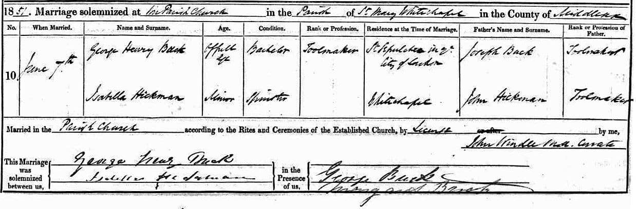 George Henry Buck married Isabella Hickman on 7 June, 1851. Not to be confusing, George Henry Buck (1825-1891), son of Joseph, married his first cousin, Isabella Hickman. George Henry took over the business of Richard Nelson at 122 Edgeware Road circa 1850. In around 1893, George Ryan, a manager for George Henry since 1870, bought the business and it became Ryan & Buck. By 1910 the name was switched to Buck & Ryan. The Joseph Buck company, however, continued to trade separately, under the ownership of Tyzack until liquidation in 1922. John Roe Hickman Sr. was a printer by trade. George Henry and Isabella had at least six children. Both fathers declared their profession as “Toolmakers.” in this marriage document