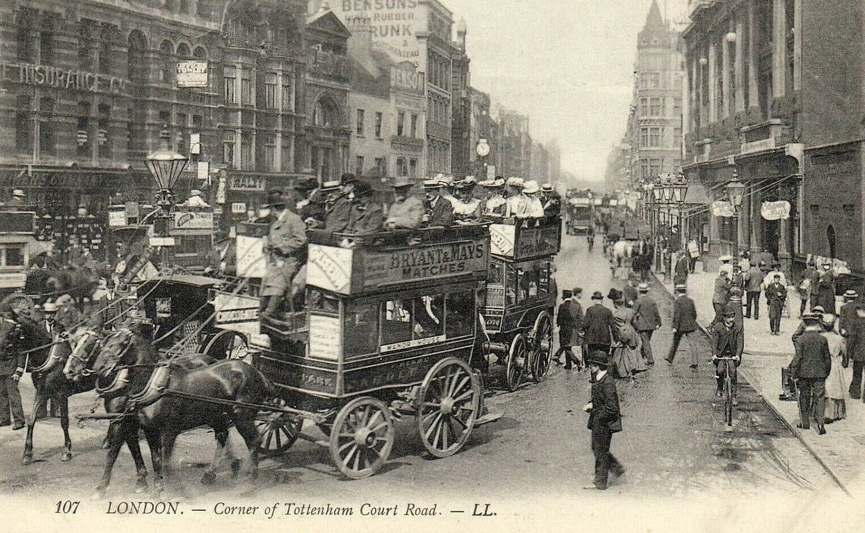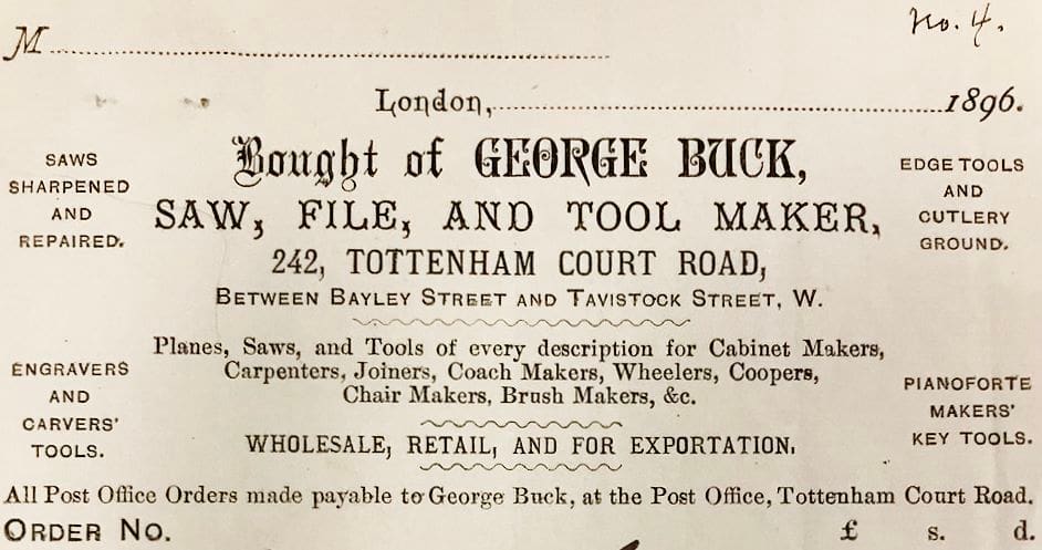 George Buck’s Tool Warehouse, 242 Tottenham Court Road, circa 1890. Left window: “Pianoforte Makers; Carpenters; Coach Makers & Engineer’s Tools.”