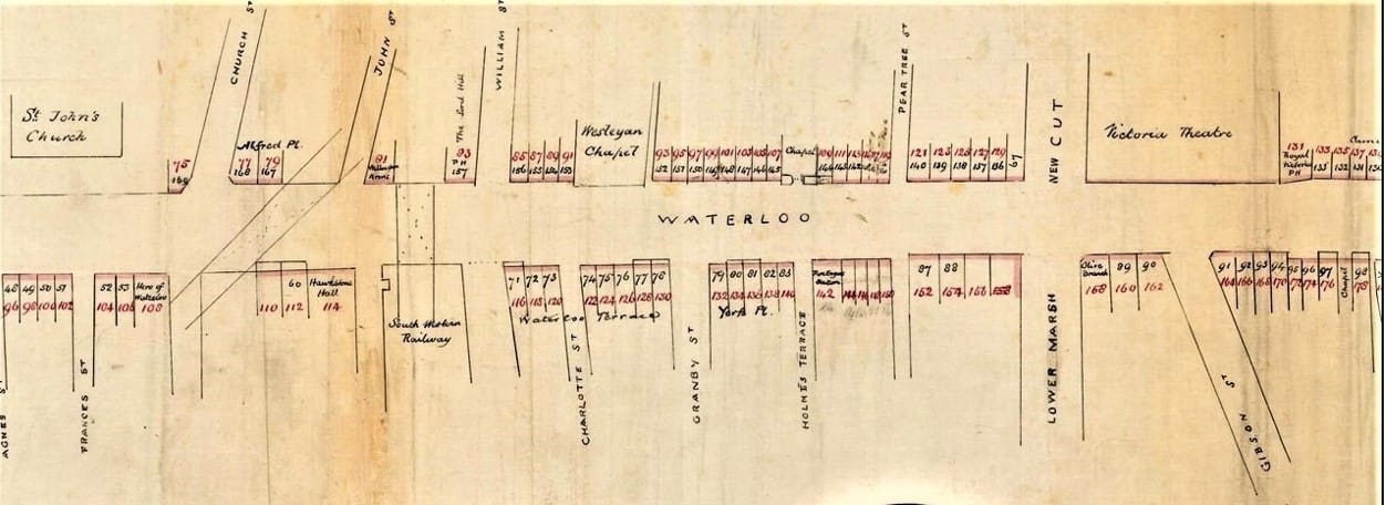 Waterloo St. Renumbering Plan, 1863, showing 164 Waterloo St., Joseph Buck Tool Warehouse. From Lambeth Archives.