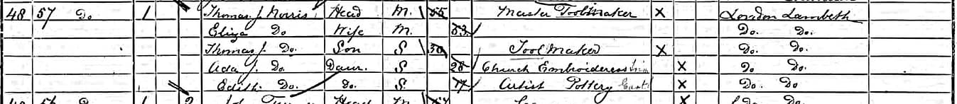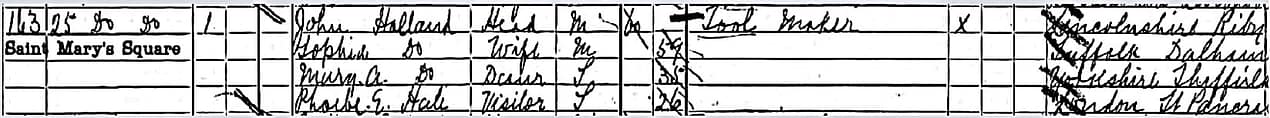 John Holland, “Toolmaker,” and his family, living at 25 Saint Mary’s Square, Lambeth, during the 1891 U.K. Census. John Holland was living at 25 St. Mary’s Square in Lambeth, but the P.O. directories listed Holland at 26 Richmond, St. George Road through 1893. After John Holland left 93 York Rd., his apparent output of tools diminished, or stopped completely at some later point.