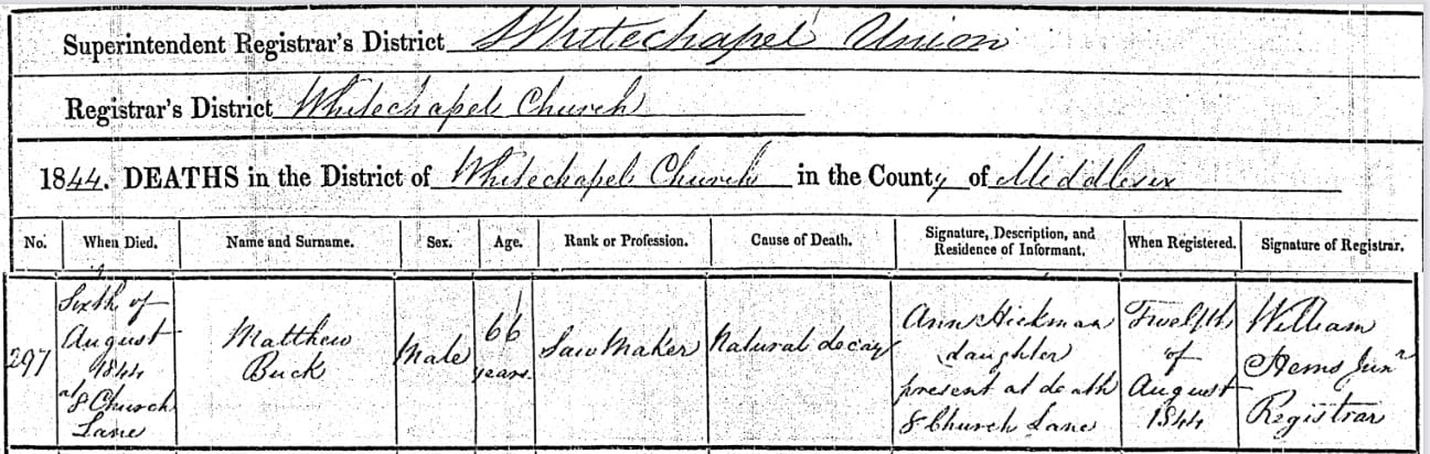 Matthew Buck Death Certificate, 6 August, 1844. Matthew Buck passed away on August 6, 1844 at 8 Church Lane (now White Church), London, England. 8 Church Lane was the business address for Buck & Hickman at that time, and Ann Hickman was present at the time of his passing. Matthew was interred near his wife in St. John-at-Hackney Churchyard at Hackney, London Borough of Hackney, Greater London, England.