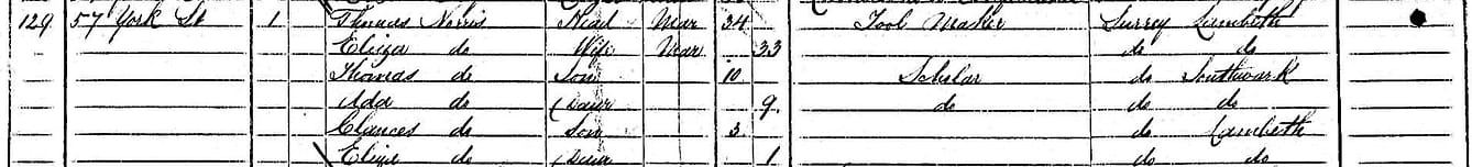 Thomas Norris Sr., at 18 Northings Head Yard, Lambeth, in the 1851 U.K. census. Thomas II, 16, was listed as an “errand boy” in the 1851 U.K. census.