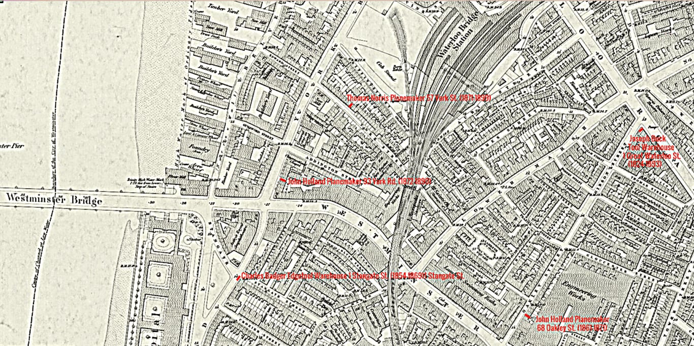 Map section shows the following: Joseph Buck, brother of George Buck, b 1802. planemaker and dealer, 164 Waterloo Rd. (1824-1893); Charles Badger, iron planemaker, 1 Stangate St. (1854-68) 93 York Rd. (1868-1869); John Holland, planemaker, 68 Oakley St. (1861-71), 93 York Rd. 1871-90); Thomas Norris tool and planemaker 57 York St. (<1871-1899).