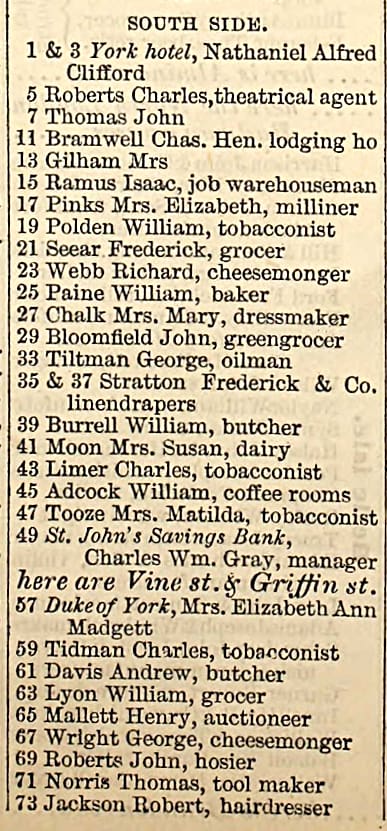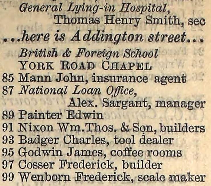 York Street Lambeth, consecutive street numbers. No. 57 York Street was not recorded at all. London Post Office Directory, 1876.