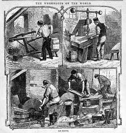 Making Saws. From “The Working Man,” 3 February, 1866. Illustrations showed phases of saw making: cutting, grinding, and punching teeth with a fly press. Not included was a furnace.