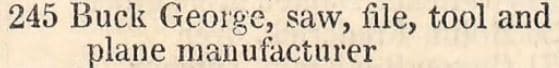 Consistently during George Buck’s life, and after his death, the Buck business was listed as a saw maker. Multiple sources for this lends credibility that the G. Buck firm actually did make saws, and possibly some other tools such as files. On the other hand, they could have been sold on the idea of being recognized as a maker of tools. At various times, all of the Buck firms listed their business under “saw, file, and plane makers.” This included Joseph Buck, Buck & Hickman, and George Henry Buck. Patriarch, saw and filemaker Matthew Buck (1776-1844) must have exerted a lifetime influence on his children.