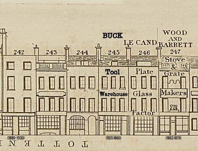 Geo. Buck, 1851 UK census. “Tool Warehouse employing 8 men.” 245 Tottenham Court Road. At the time of the 1851 census, George and Mary Buck and their children were living in the housing quarters above the tool warehouse which was on the ground floor.
