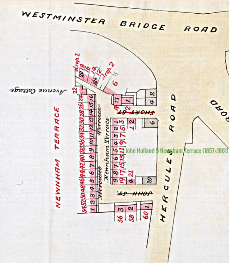 John Holland and his family at 67-68 Oakley St., in the 1861 U.K. Census. In 1861, the Hollands were one of four families living at No. 67 Oakley St., but there was only one family living at No. 68. No. 67 may have been a larger building, or the residents there may have been crammed in! At some point during John Holland’s stay at Oakley St., he purchased the properties at Nos. 68 and 69 Oakley St., which probably were cheap because it was not a prime neighborhood in Lambeth. After moving to 93 York Road, Holland rented out Nos. 68 and 69 Oakley St.