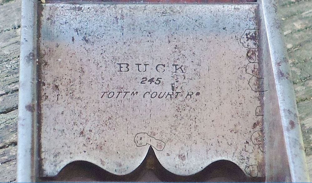 BUCK marked bridge, with initials J H scratched in or acid etched. Some markings have JH letters running together, sharing the left vertical line of the H: a monogram. It must be where Thomas Norris got the idea for his TN monogram. “BUCK” marked bridge, with initials “J H” scratched in or acid etched. This is exactly the same photograph that was previously posted, when I had initially thought the plane was made by Norris. Some of the letters are now circled, most of which run along near the left cheek of the plane. Some markings have “JH” letters running together, sharing the left vertical line of the “H,” in a monogram. It must be where Thomas Norris got the idea for his “TN” monogram. Circa 1862 to 1866, when Mrs. G. Buck was at 245 and 247 Tottenham Court Road.