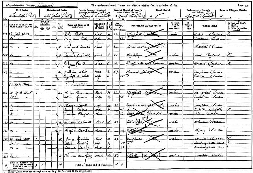 Nos. 21 and 23 York Road, Lambeth in the 1901 U.K. Census, with William Clayfield, “Tool Makers’ Assistant” (salesman) living and working at 21York Road.