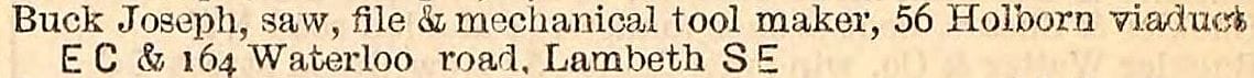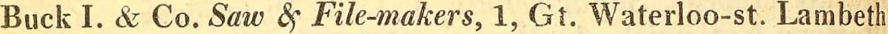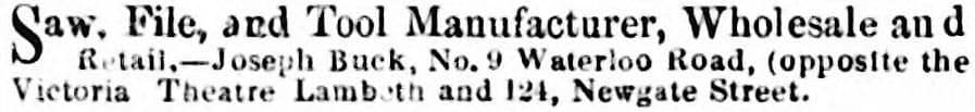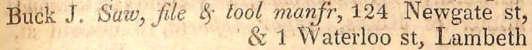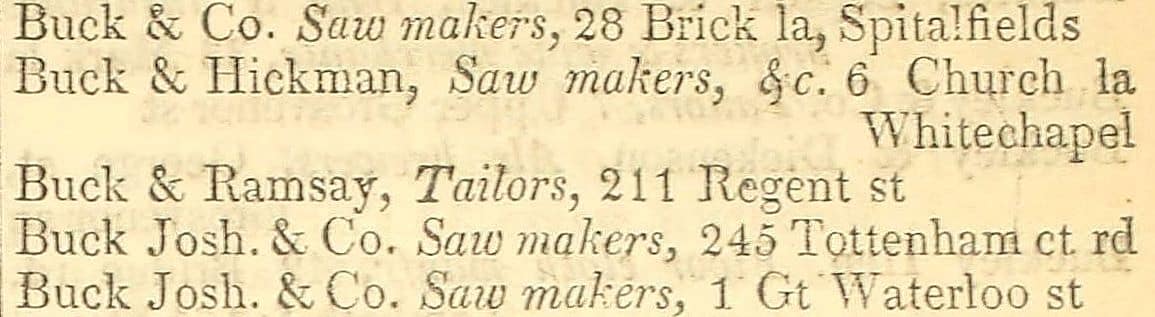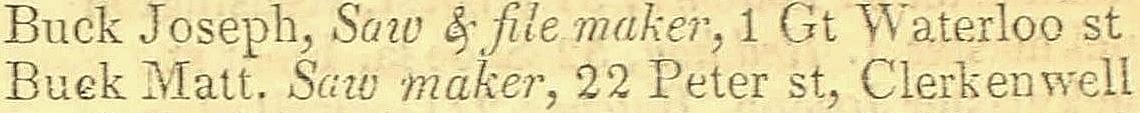 Matthew Buck 22 Peter St. Clerkenwell, under “Saw Makers,” in the 1825-6 Pigot’s London Street Directory.