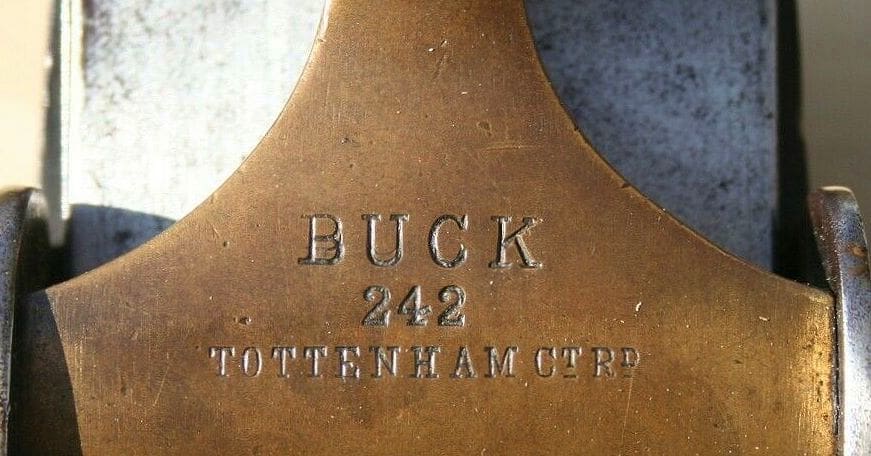 Proprietary stamps for “BUCK” metal planes rarely included a first initial after 1850 or so even though George Buck would usually stamp his Tottenham Court Road address on the bridge or lever cap. This differed from items marked specifically “G. BUCK,” such as bow drill stocks, saws, specialist piano tools, chisels, braces, and wooden planes. Since a fair amount of capitol was tied up with metal infill planes, it would be a reasonable assumption that all three Buck businesses participated in selling these products by pooling their money.
