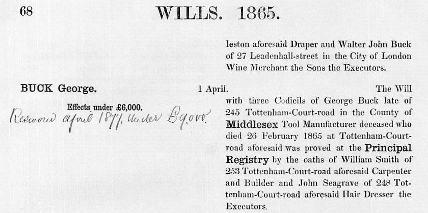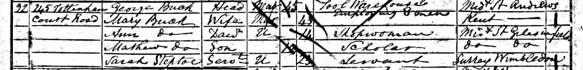 Geo. Buck, 1851 UK census. “Tool Warehouse employing 8 men.” 245 Tottenham Court Road. At the time of the 1851 census, George and Mary Buck and their children were living in the housing quarters above the tool warehouse which was on the ground floor.