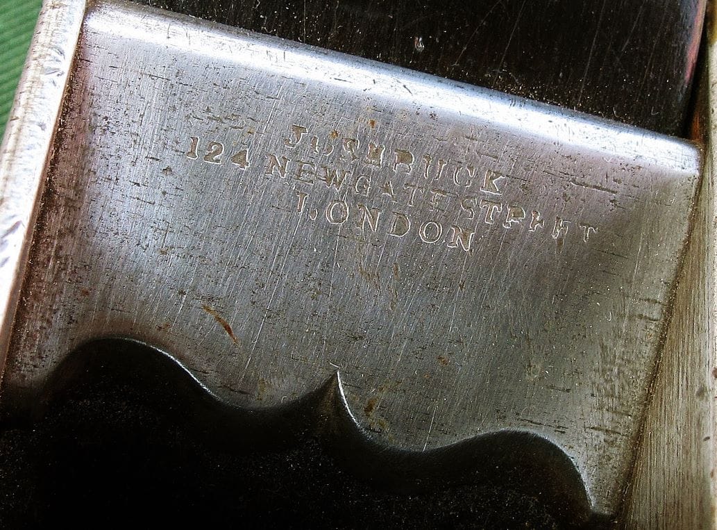 BUCK marked bridge, with initials J H scratched in or acid etched. Some markings have JH letters running together, sharing the left vertical line of the H: a monogram. It must be where Thomas Norris got the idea for his TN monogram. “BUCK” marked bridge, with initials “J H” scratched in or acid etched. This is exactly the same photograph that was previously posted, when I had initially thought the plane was made by Norris. Some of the letters are now circled, most of which run along near the left cheek of the plane. Some markings have “JH” letters running together, sharing the left vertical line of the “H,” in a monogram. It must be where Thomas Norris got the idea for his “TN” monogram. Circa 1862 to 1866, when Mrs. G. Buck was at 245 and 247 Tottenham Court Road.