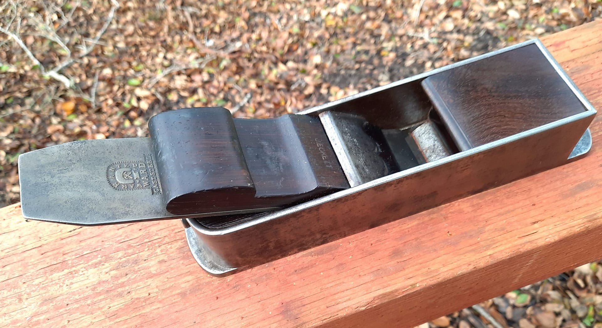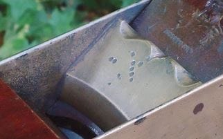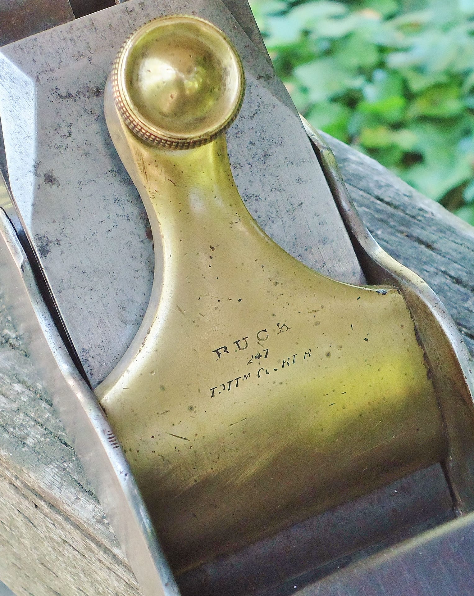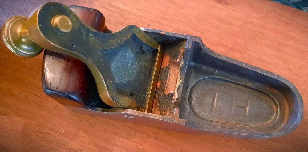 In the case of Smoother No. 213, a large “I.H.” was added into the casting underneath the rear infill. I would not have discovered this unless the rear infill had come unglued. Additionally, “Holland, London” was stamped into the underside of the bronze lever cap.