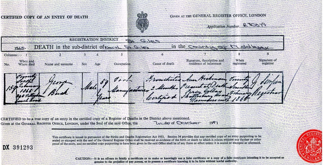 George Henry Buck married Isabella Hickman on 7 June, 1851. Not to be confusing, George Henry Buck (1825-1891), son of Joseph, married his first cousin, Isabella Hickman. George Henry took over the business of Richard Nelson at 122 Edgeware Road circa 1850. In around 1893, George Ryan, a manager for George Henry since 1870, bought the business and it became Ryan & Buck. By 1910 the name was switched to Buck & Ryan. The Joseph Buck company, however, continued to trade separately, under the ownership of Tyzack until liquidation in 1922. John Roe Hickman Sr. was a printer by trade. George Henry and Isabella had at least six children. Both fathers declared their profession as “Toolmakers.” in this marriage document