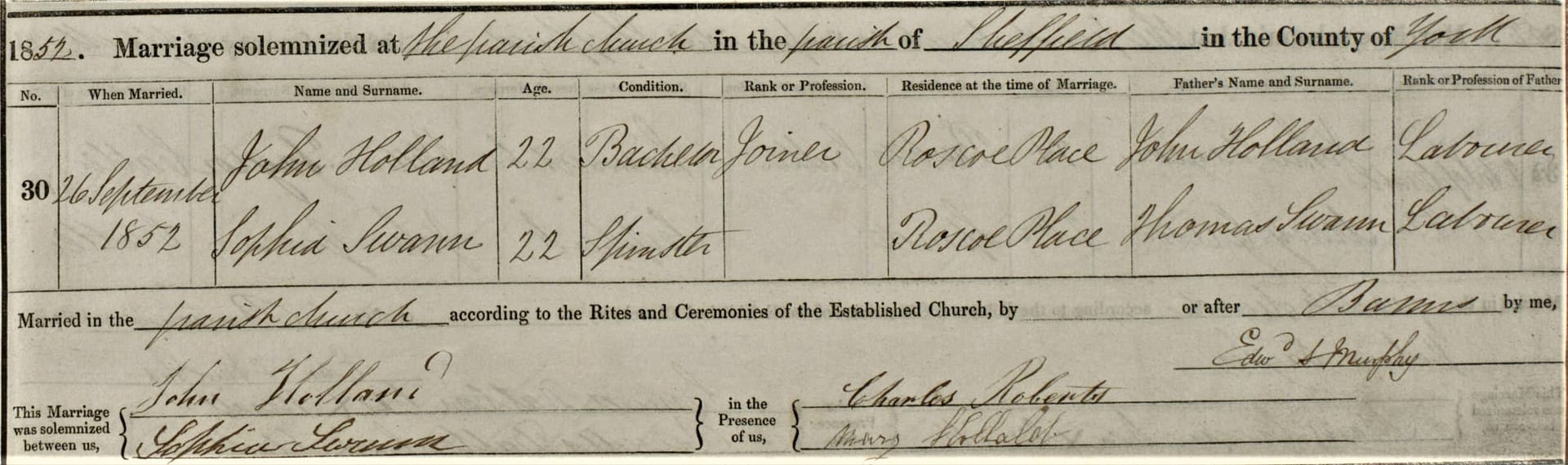 John Holland married Sophia Swann in Sheffield, on 26 September, 1852. Sophia Swann (1830-1915) was born in the hamlet of Dalham, Suffolk County. Sophia met John while she was as a housekeeper working for John and Maranne Wick, a young couple in their late 20s, both chemists, living at 59 High St. in Sheffield. In his 1851 U.K. Census entry, Thomas Swann reported his trade as a “Butcher.”