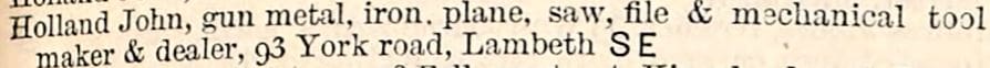 John Holland, in the 1880 London Post Office Directory. Gunmetal, iron, plane, saw, file. & mechanical tool maker & dealer:” Holland was making a wide range of products. Not just planes.