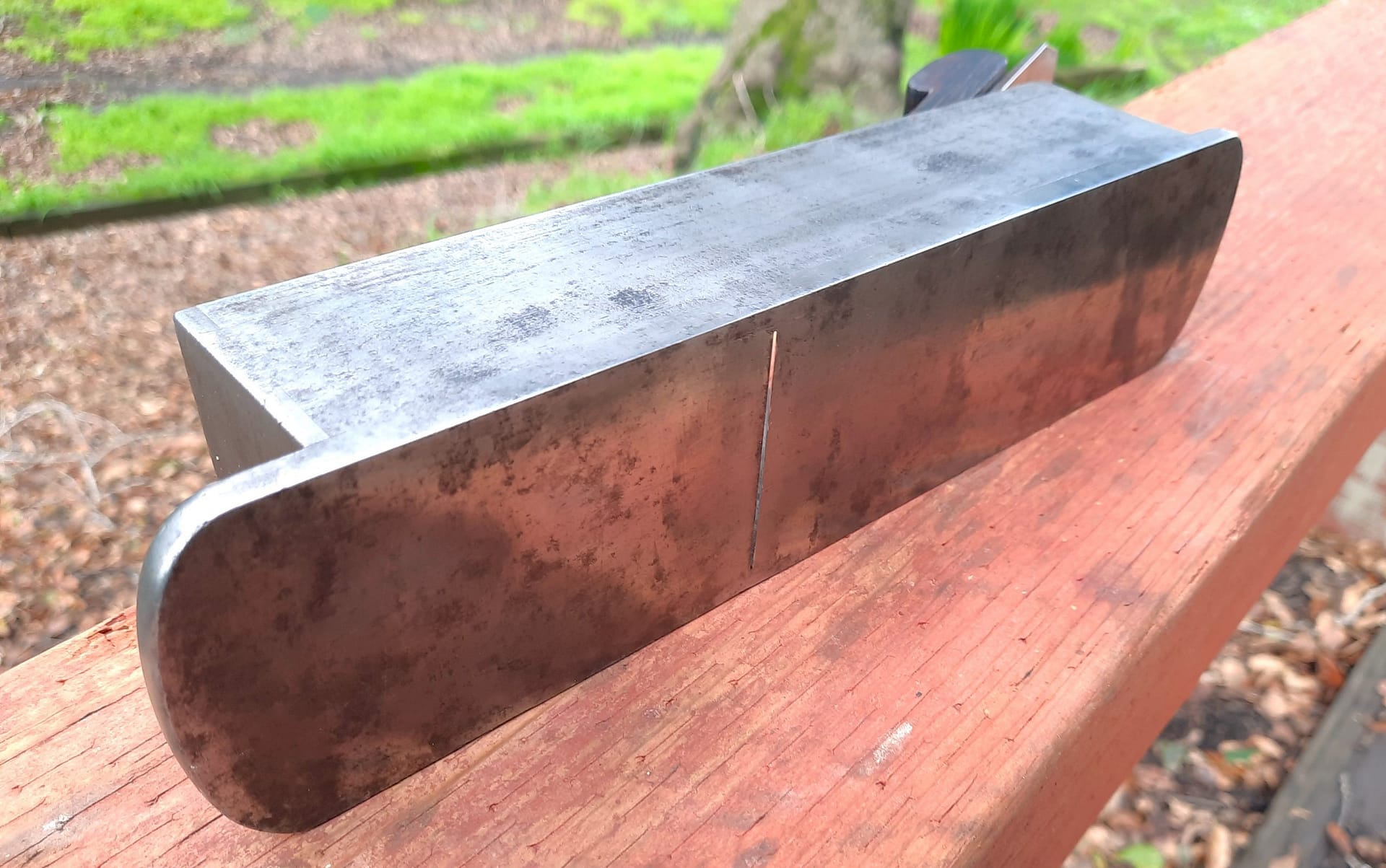 Sole of J. Buck mitre plane, showing tight mouth. Dovetails were placed on either side of the mouth, instead of the usual tongue and groove joint. After almost 200 years, this has not posed a problem.