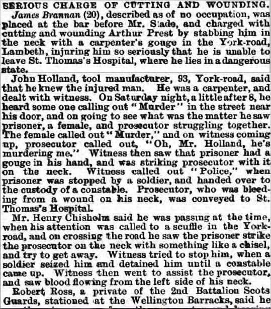 Yesterday shortly before ten a loud explosion was heard in the neighbourhood of Westminster Bridge Road causing considerable alarm. The police ascertained that a serious explosion had occurred at the tool and cutlery establishment of Mr. Holland at 93, York Road. It appeared that at the time the son of the proprietor Samuel Holland aged 17, upon entering the parlour at the rear of the shop had smelt strong of gas. Unfortunately he sought the cause with a naked light, shattering the windows in the shop and damaging the display trade, which fortunately will not prevent the business from being carried on as usual.