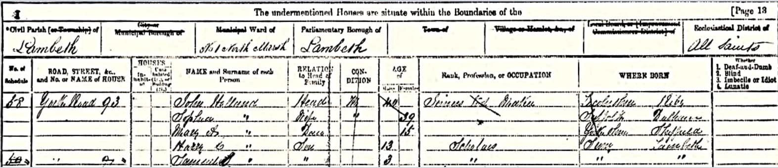 Harry Charles Holland “Tool Dealer”, his family. along with Samuel Swann Holland, also a “Tool Dealer” 71 Falcon Road, Battersea. 1891 U.K. Census.