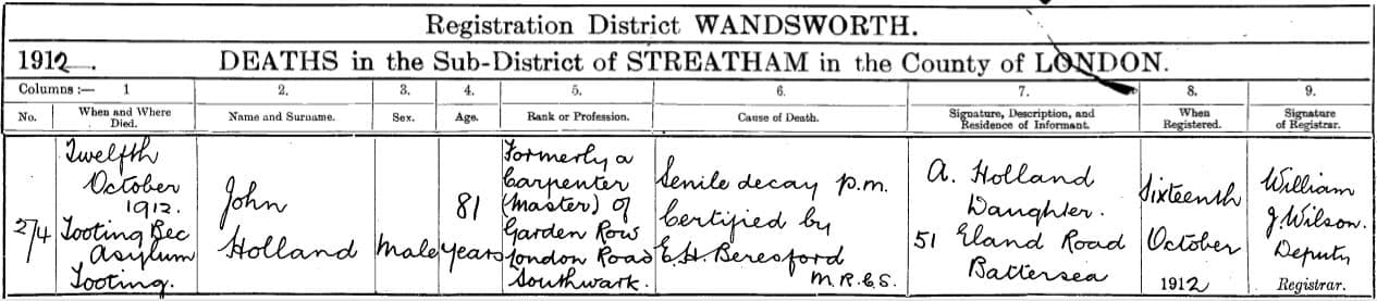 John Holland, 80, was listed as a retired “carpenter,” in the Tooting Bec Asylum, Wandsworth, during the 1911 U.K. census; senility must have overcome him by around 1907.