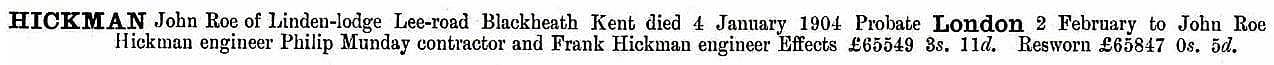John Roe Hickman in the Probate Calendar. £65,847 in 1904 would be more than $10,000,000 in today’s dollars. For comparison, Sheffield edgetool maker William Butcher died with a fortune of £100,000 in 1870. Scottish-born steel magnate Andrew Carnegie amassed a fortune of $380,000,000 or $309 Billion in today’s currency.