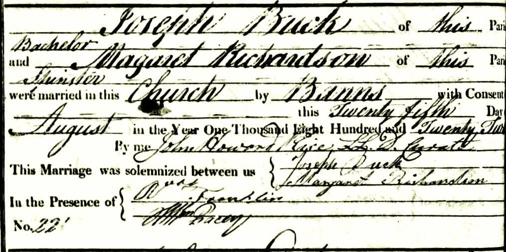 Matthew and Mary Buck had five children: Joseph (1802-1884) born at Westminster, London, England and George (1805-1865), Ann (1807-1895), James (1809-1810) all born at Clerkenwell, Middlesex, England and Elizabeth (1810- ) born at St Andrew, Middlesex, England.