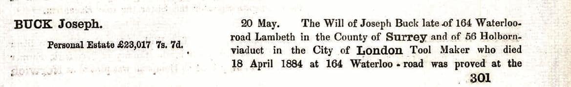 Joseph Buck, in the Probate Index, died 18 April, 1884. £23,000 in 1884 equals about $3,500,000 in today’s dollars. On average, businesses which sold tools as a concerted and organized effort, along with making tools, or dealers who traded in tools exclusive from making them, did better financially than On 26 February, 1865, George Buck passed away at age 59. Many of the best years for George Buck’s business were still ahead of them, and their successors actively maintained the tool business into the 1980s.those who primarily focused on making tools.
