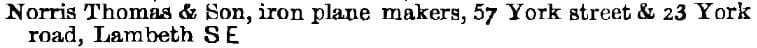 Was Thomas Norris Sr. working for John Holland during the years he was not listed in Kelly’s London Post Office Directory? If so, I believe it would have been on a piecework basis rather than a regularly structured employment, with the elder Norris consulting with Holland at his 93 York Street address, and performing most of the actual planemaking work at his own shop at 57 York St. Historically, sole proprietors have been resolutely independent types, which often precluded a formal collaboration.