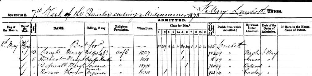 Thomas Norris I’s admission to Lambeth Workhouse. Thomas Norris I (1804-1886) was a “music engraver,” which was a skill that involved a great deal of precision. By the 1870s and 1880s, Norris the elder was admitted several times to the workhouse.