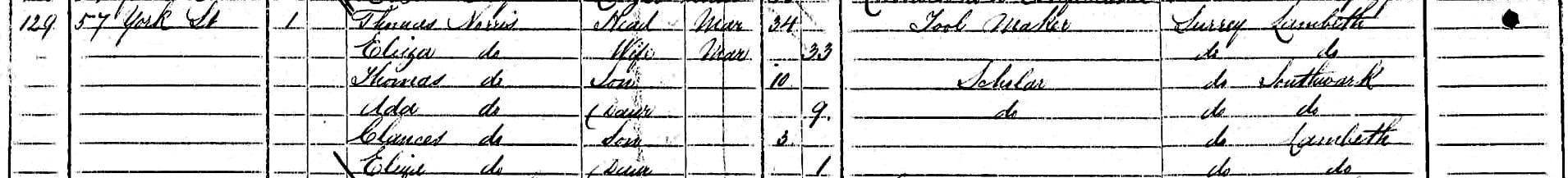 Thomas James Norris married Eliza Knott, on 15 May. 1859, at St. Mary’s Church, Lambeth. Bride Eliza Knott (1839-1918), and surviving children (from as many as 7) included: Thomas James (1860-1936); Ada Jane, (1862-1944); Clarence (1867-1876), Elizabeth (1870-1949); Edith A.(1874-1959). In 1859, Thomas Norris declared his profession as a “tool maker.”